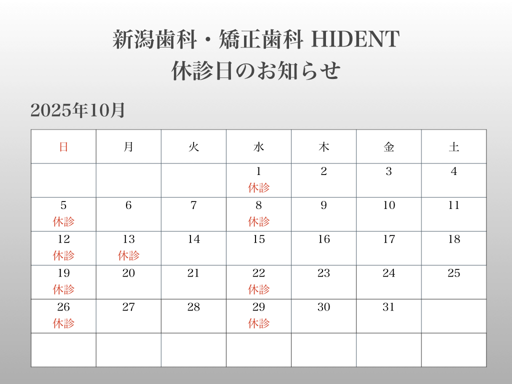 毎週日曜日と1日(水)、8日(水)、13日(月)、22日(水)、29日(水)は休診日となります。