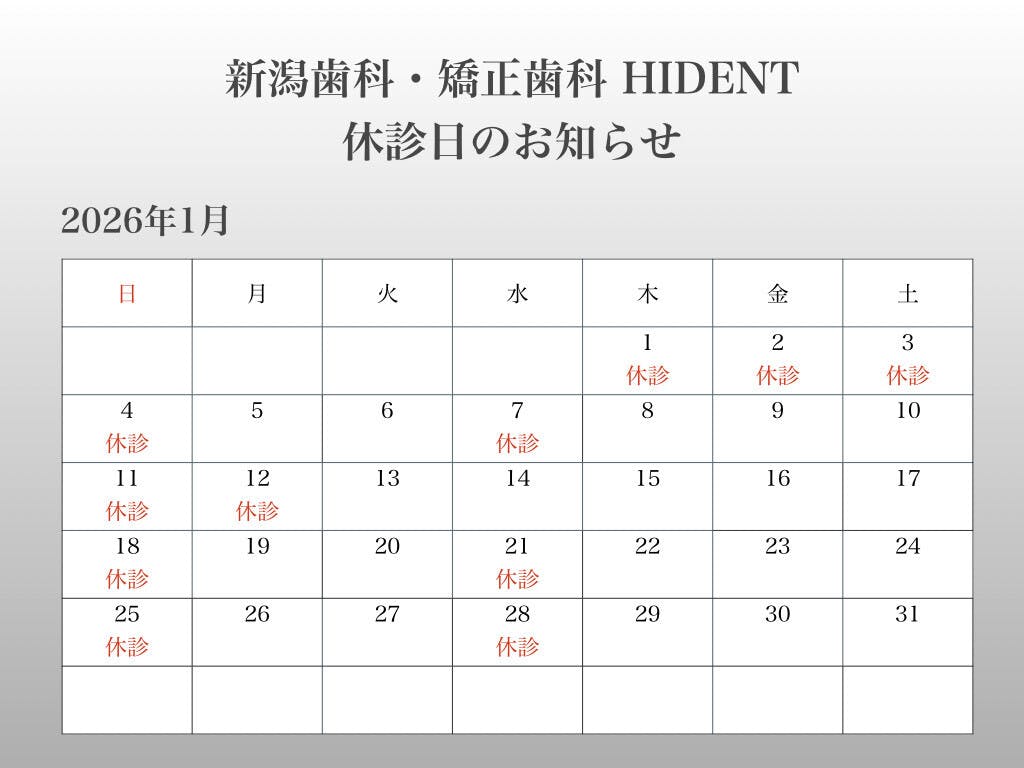 また、1日(月)〜4日(日)まで年始休診日となり、1月5日(月)より通常診療とさせていただきます。