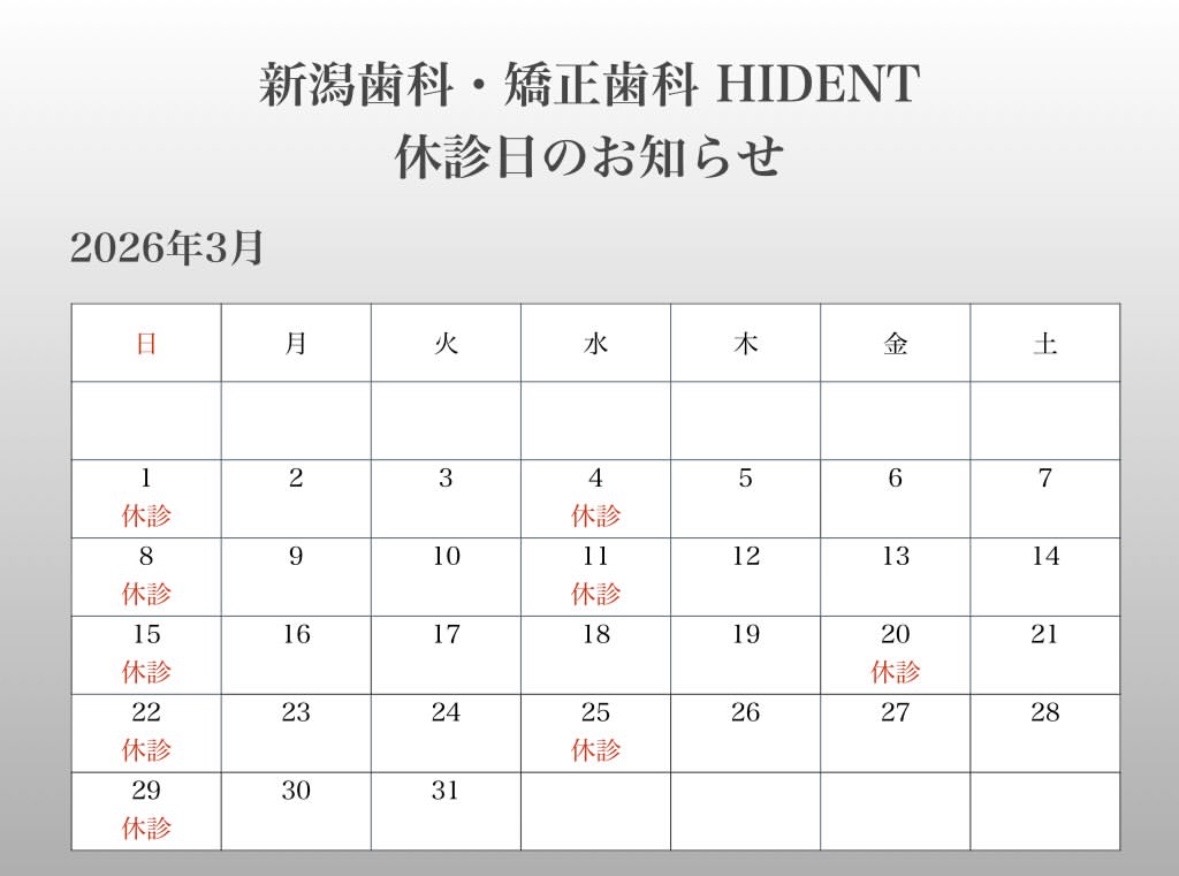 毎週日曜日と4日(水)、11日(水)、20日(金)、25日(水)は休診日となります。